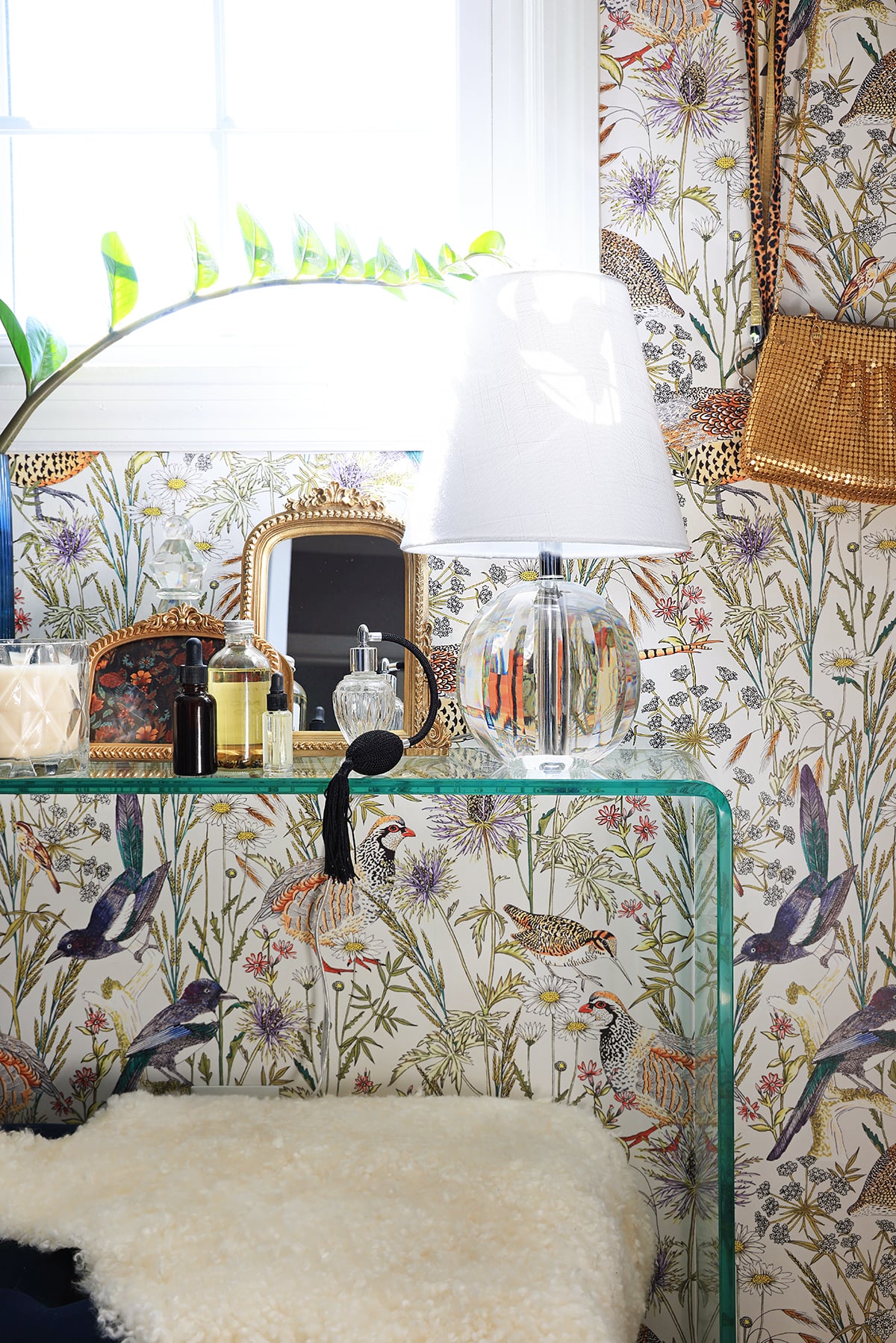 In my master closet, I went bold and used a beautiful wallpaper called Woodland Birds by Milton & King. It was a bit of a departure from my usual style, but I absolutely love the personality it brings to the space. The vibrant design makes me smile every time I open my closet doors!